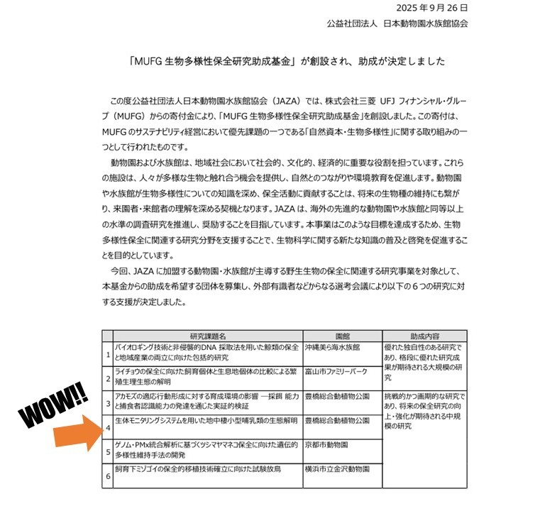 モグラ類の研究がMUFG生物多様性保全研究助成基金に採択されました!