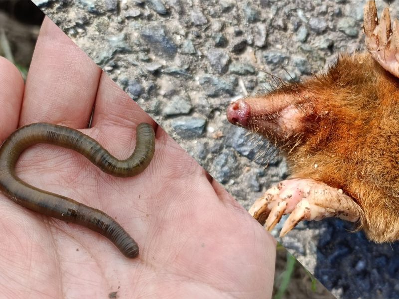 田んぼで見つけたクソミミズ(左)と園内で見つかったコウベモグラの死骸(右)