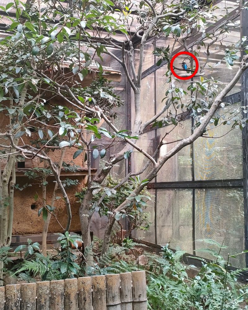 こちらが野鳥園のカワセミなどが展示されているケージになります。カワセミの他にコマドリ、セグロセキレイ、ウグイス、メジロを一緒にして混合展示を行っています。