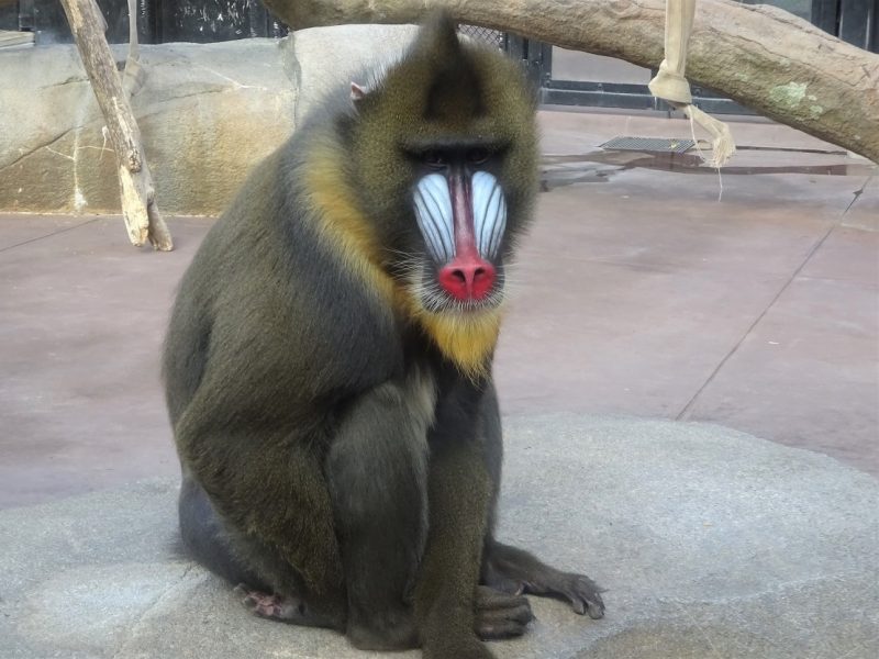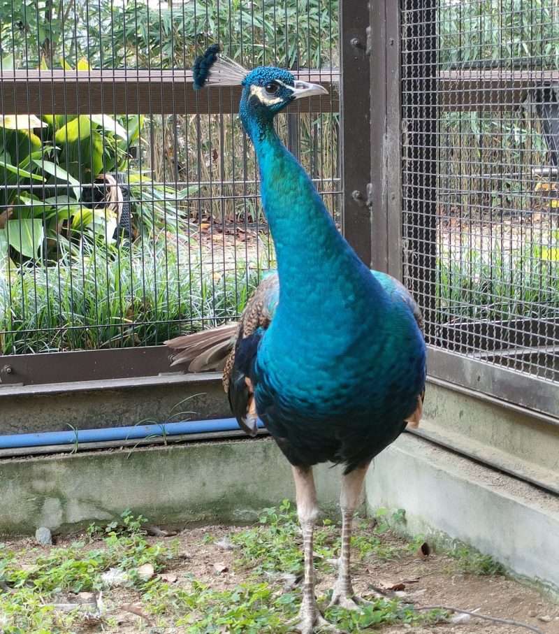 この青く見える羽は色素ではなく、構造色と呼ばれるものになります。羽毛の細かい構造によって光が干渉し、光の角度や当たり方によって鮮やかな青緑色に見える現象です。私たちの身近なもので言えばCDの盤面やシャボン玉表面の虹色などがあります。のんほいパークの動物たちの中では、マンドリルやクジャクが構造色を持っています。