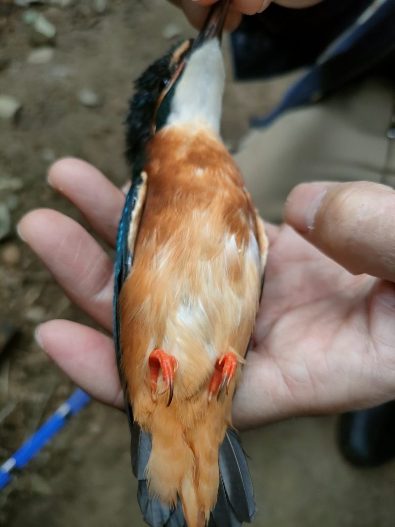 お腹側はオレンジ色、頭の上から背中と翼は青緑色の体色をしており、鮮やかなコントラストがとても綺麗ですね。