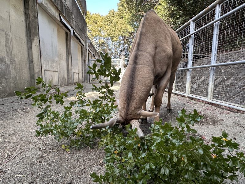 バックヤードでは餌を食べ終わると、枝で遊ぶ様子や柵に角を擦り付ける行動がよく見られ、時には扉を壊してしまうのではないかと心配になるほどの力強く、好奇心旺盛な一面がうかがえました。
