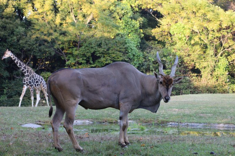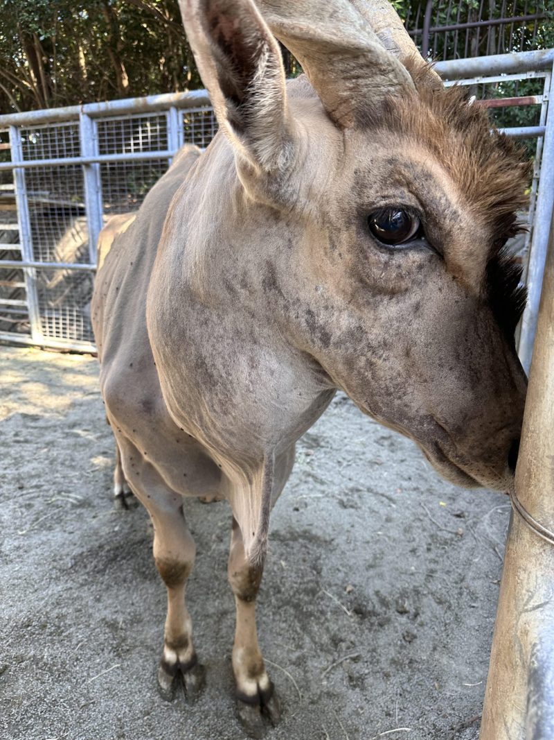 これまでバックヤードで過ごしていたオスのエランド「ビスコ」がついに展示場に登場しました!