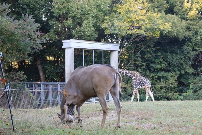 ウリュウとともに展示場に出てからは、お互い深く干渉することもなく、芝生の草を食べたり、大きな角で地面を掘り起こしたり(芝生が枯れてしまうか心配(-_-;))、環境に慣れてきている様子です。