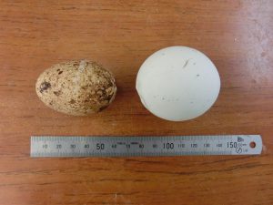 ちなみにこれがアフリカワシミミズクの卵です。(写真右がアフリカワシミミズク、左が一般的な卵の形。ちなみにハヤブサの卵です!)