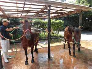 今年の8月は猛烈な暑さとなっています。馬は、人と同じく、ほ乳類のなかで一番の汗かきと言われています。暑い日は、シャワーや濡れタオルで体の熱を落としてから部屋に