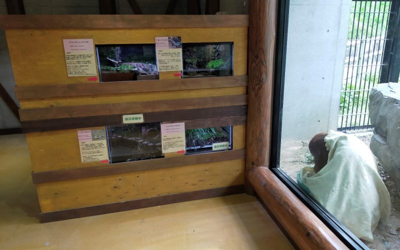 新たに設けた両生類展示ブース。右はスマトラオランウータンのウータン(オス)。
