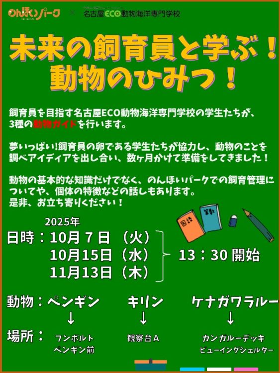 飼育員を目指す名古屋ECO動物海洋専門学校の学生たちが、3種の動物ガイドを行います。