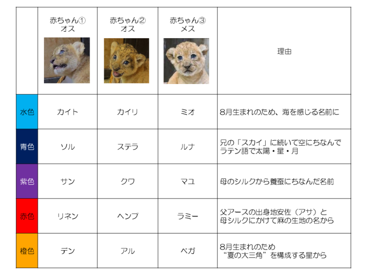 ◆方法:職員考案の名前候補5グループに水色・青色・紫色・赤色・橙色を割り当て、同じ5色の大型犬用ボールを放飼場に置き、母ライオンのシルクが最初に選んだボールの色と同じ色の候補に決定します。