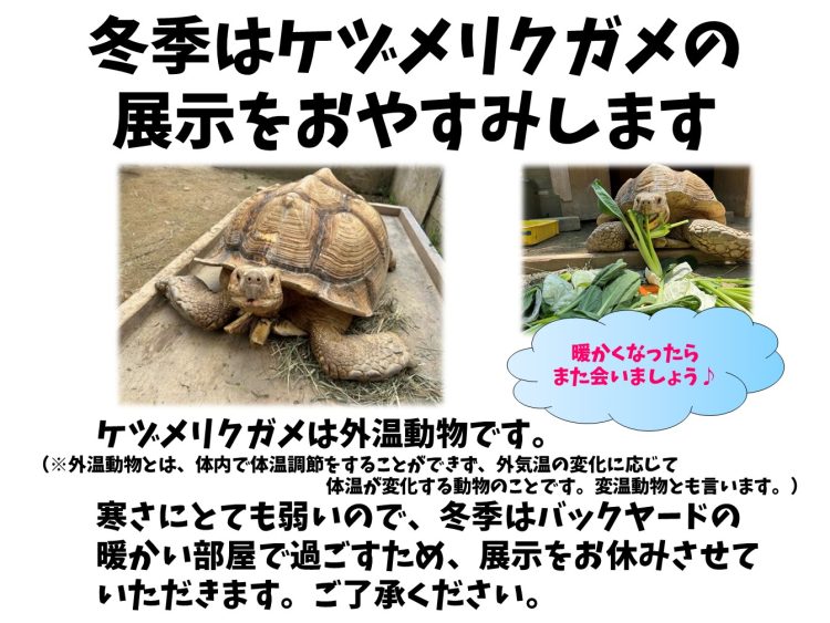 ケヅメリクガメは冬眠しない種類のカメであり、暑さには強いですが、寒さには弱い動物です。 そのため、健康を考え温度管理を行うため、冬季はバックヤードで飼育します。ご了承くださいませ。