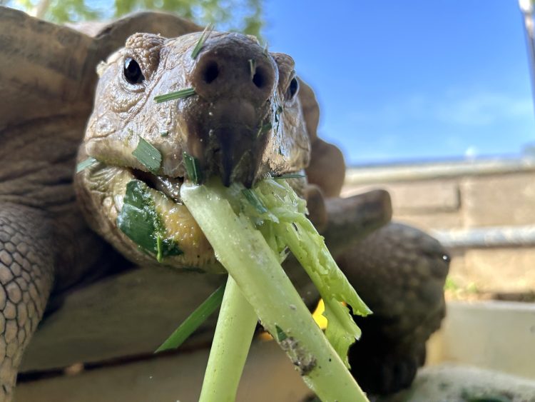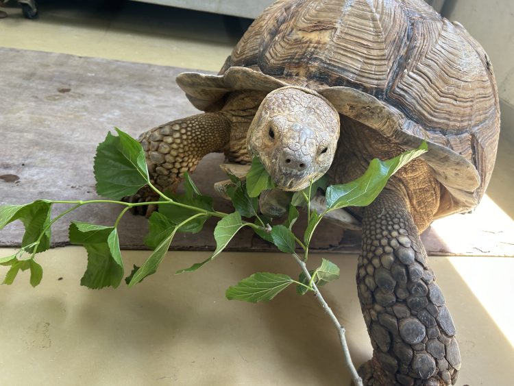 ケヅメリクガメのリク、 冬季は寒さ対策のため、もぐもぐ広場からバックヤードへとお引越しをします。