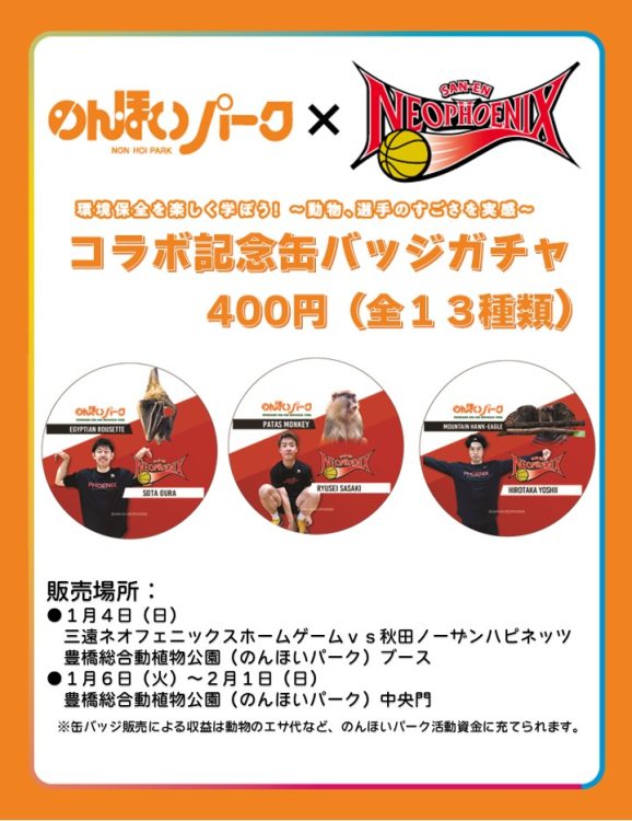 1月6日(火)~2月1日(日)まで、コラボを記念したコラボ記念缶バッジの販売を行います。缶バッチ販売による収益は動物のエサ代などのんほいパーク活動資金に充てられます。