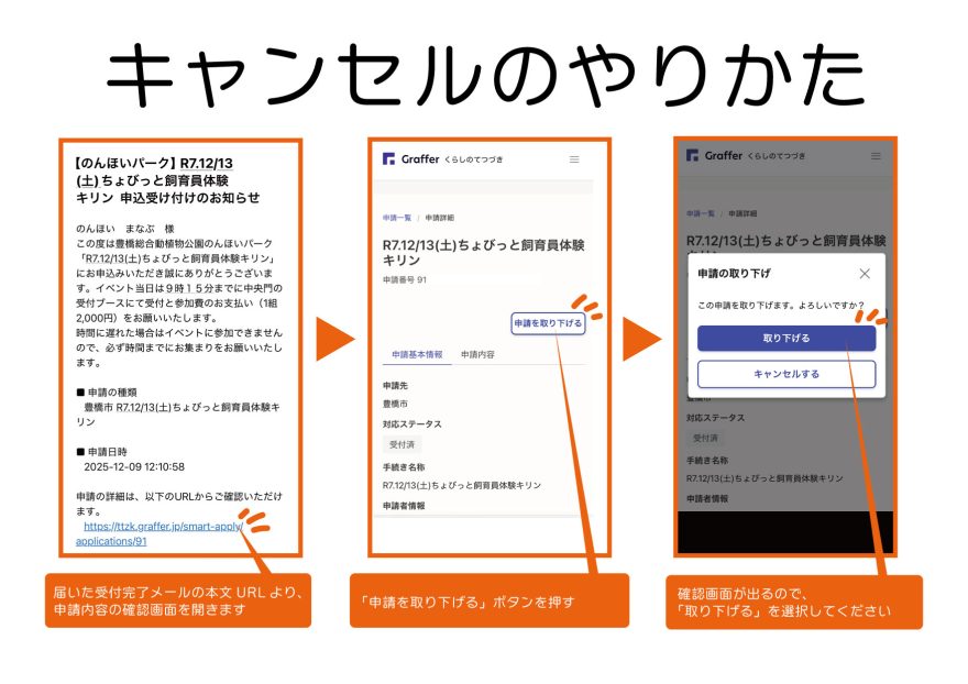 ●イベント前日までのキャンセルは、申込時のメールアドレスにお送りした案内に記載のURLより、「申請を取り下げる」を押してキャンセル処理をしてください。