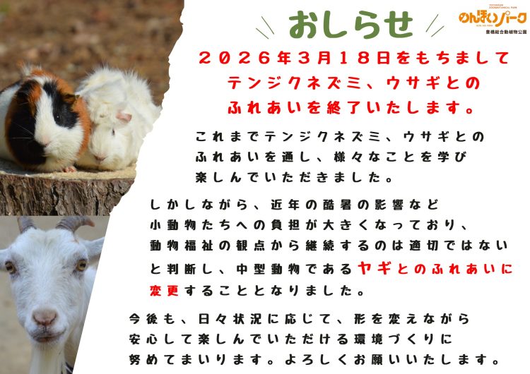 2026年3月18日をもちまして、テンジクネズミとウサギとのふれあい体験を終了いたします。